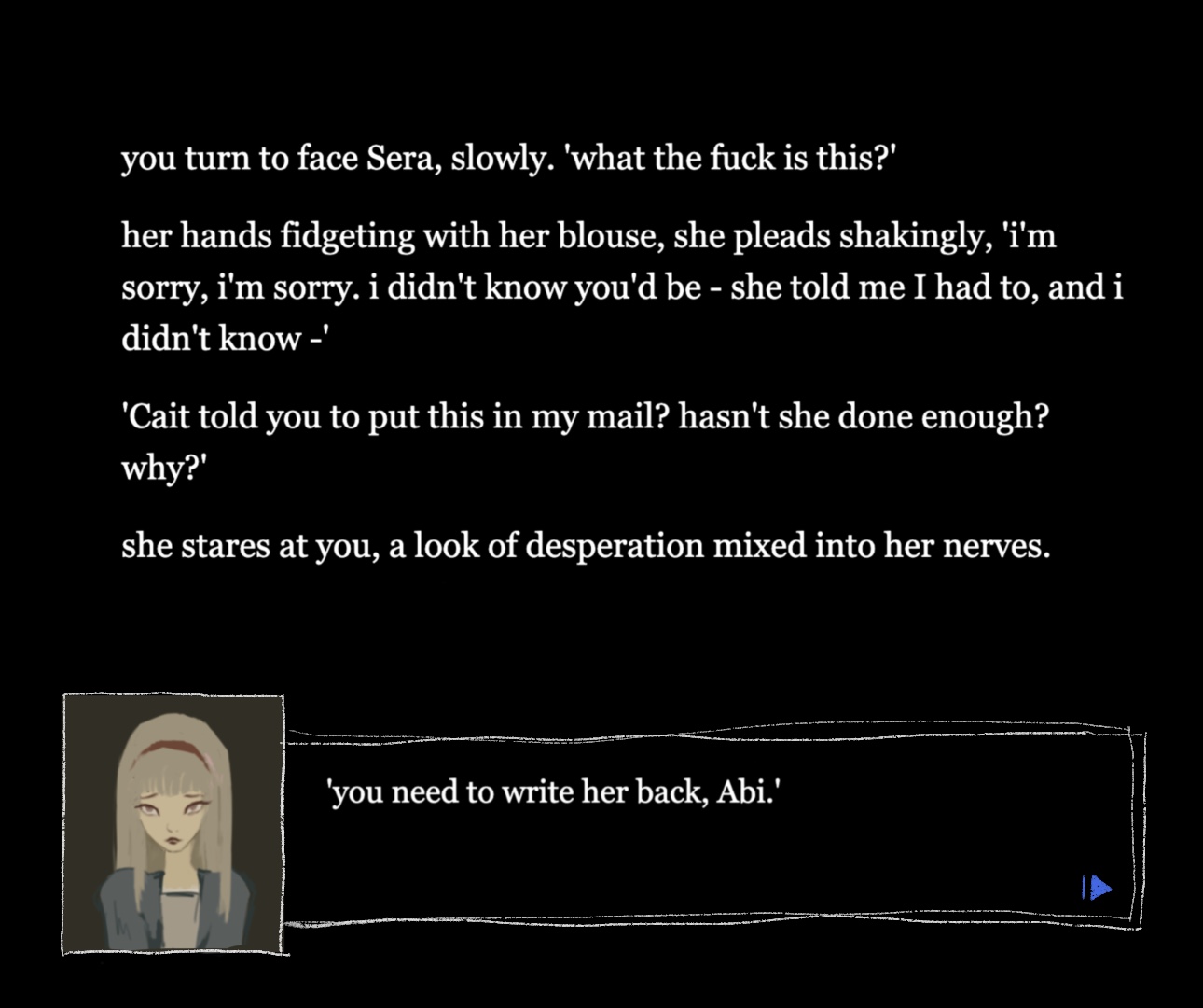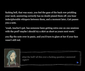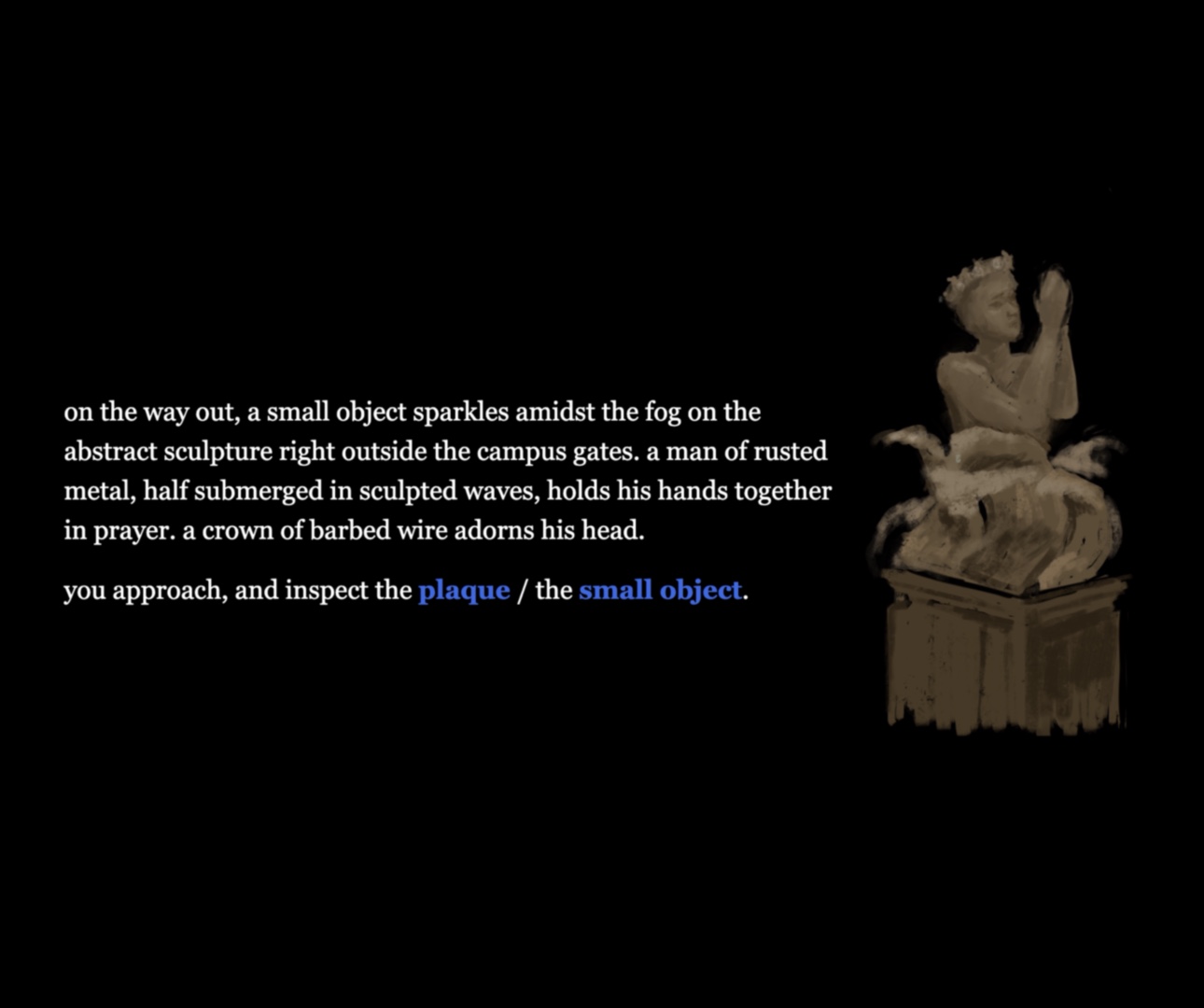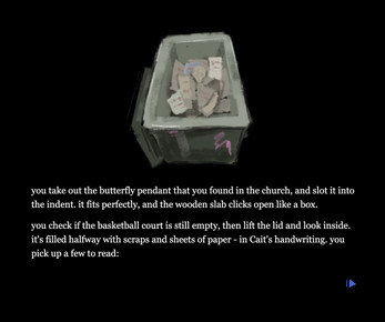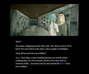 A text-based choose-your-own-adventure mystery game - your choices matter. There are 3 endings, collectables, the choice to befriend characters, and a heaven/hell system that will affect your path.